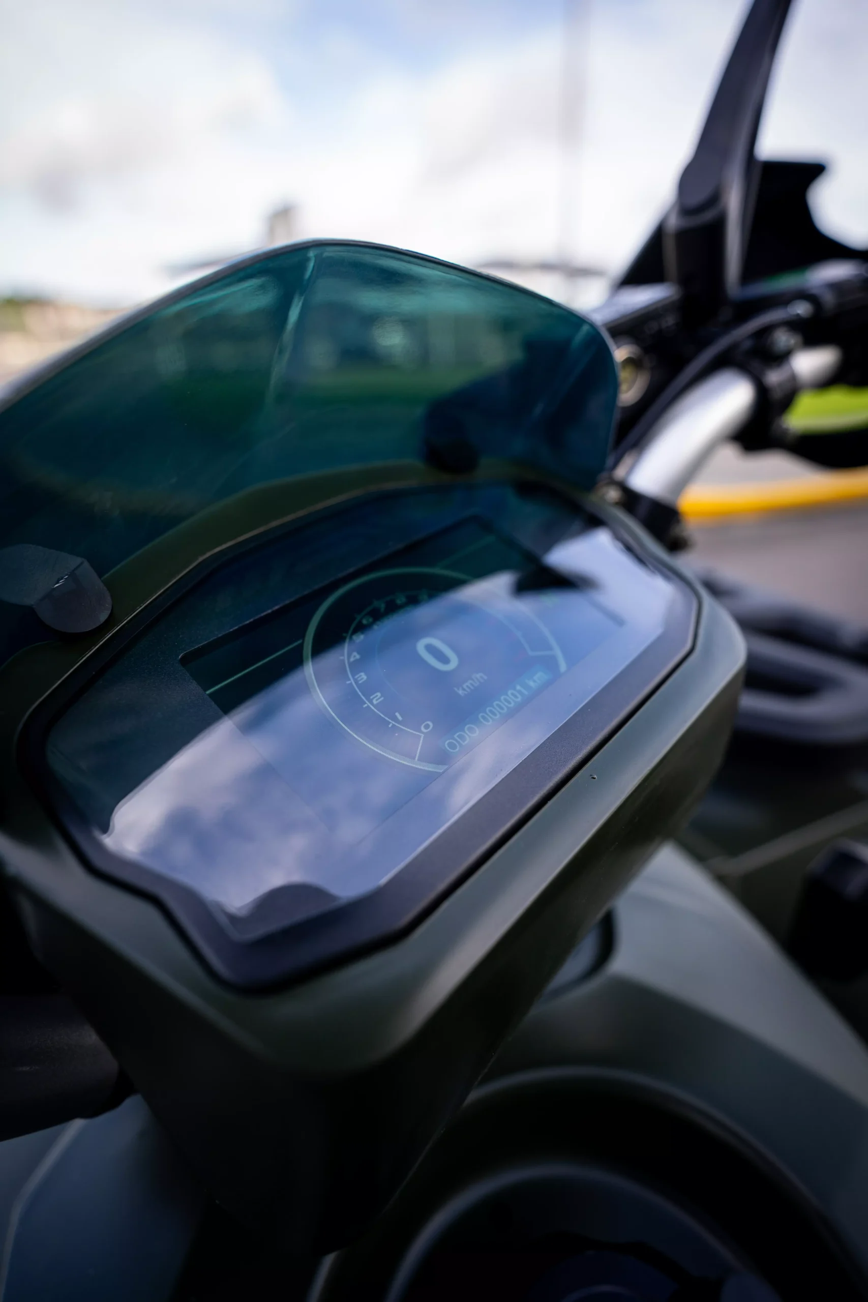 Painel digital com indicador de combustível, marchas, neutro e conta-giros.