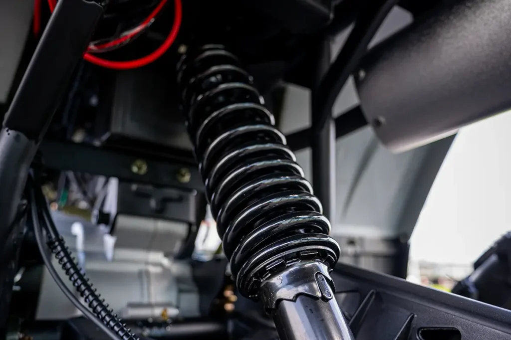 Suspensão independente nas rodas dianteiras e suspensão monoshock no eixo traseiro.