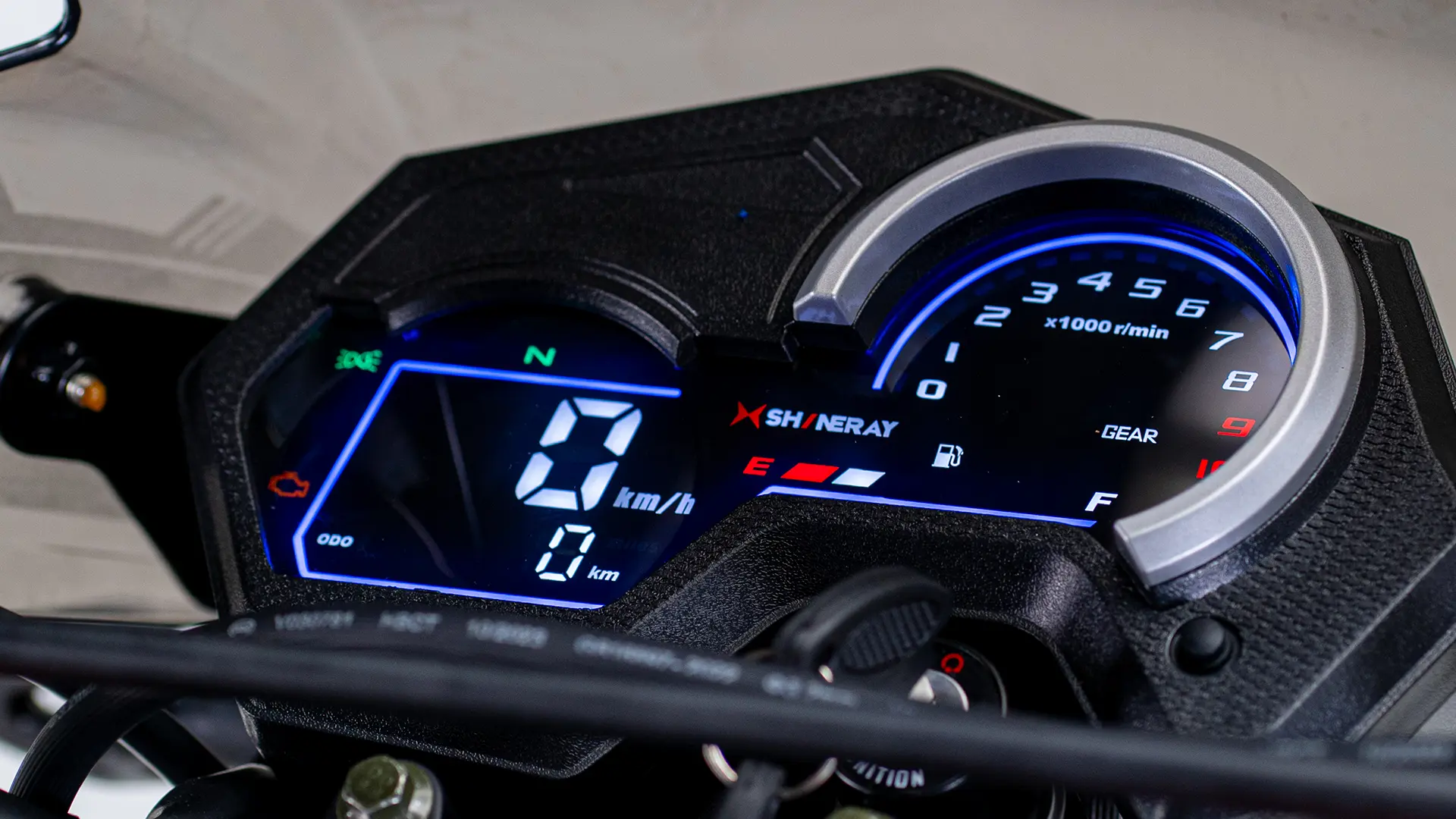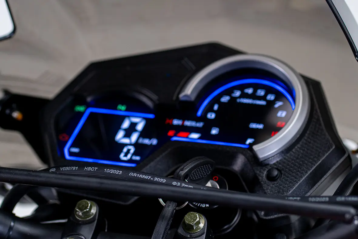 O painel da SHI 175s EFI é 100% digital, oferecendo uma visão clara das informações essenciais. Ele exibe o indicador de combustível, velocidade, marcha, neutro, conta giros, pisca alerta e lampejador de farol. O painel proporciona praticidade e segurança, garantindo que todas as informações necessárias fiquem visíveis ao alcance dos olhos.